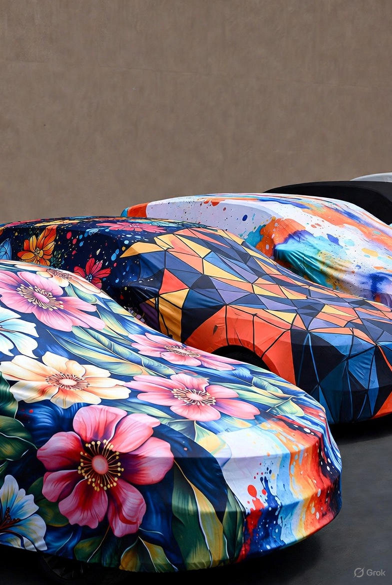 تتنوع أغطية السيارات المخصصة لتناسب احتياجات مختلفة، هناك الأغطية الخارجية، المصنوعة من مواد مقاومة للماء مثل البوليستر أو الفينيل، والتي يمكن تخصيصها برسومات رقمية أو طباعة حرارية، هذه الأنواع مثالية للسيارات المركونة في الهواء الطلق.